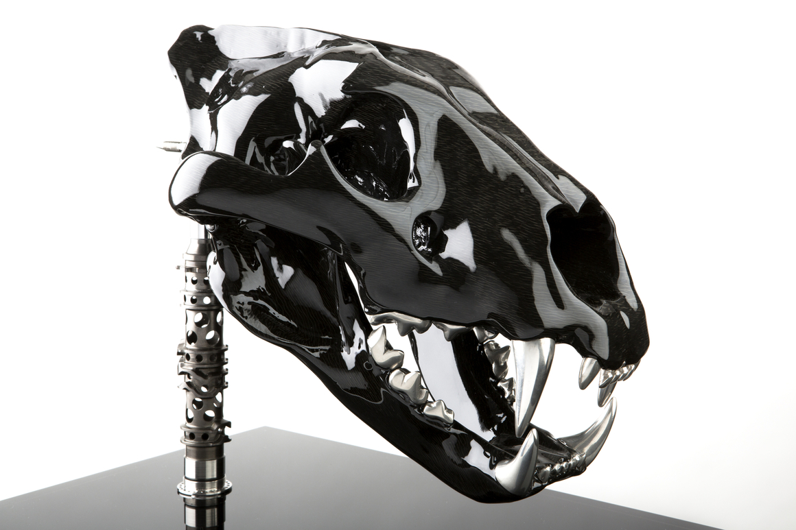 The layered potency of the apex predator is the subject of Carbon King, a limited-edition, anatomically correct and to scale sculpture of a lion’s head in solid carbon fibre by Alastair Gibson. The pioneering artist has used bismuth alloy for the teeth, a hard yet brittle material, whereas the bone structure of the skull consists of 333 plies of carbon fibre reinforcing the brutal tenacity of a lion’s execution technique.