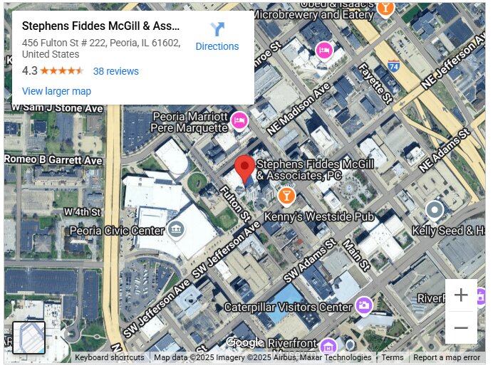 Stephens Fiddes McGill & Associates, P.C. offers a full range of legal services for personal injury, workplace accidents, or wrongful treatment cases. It serves clients across Central Illinois, including Peoria, Pekin, East Peoria, Galesburg, Canton, Morton, and Washington.