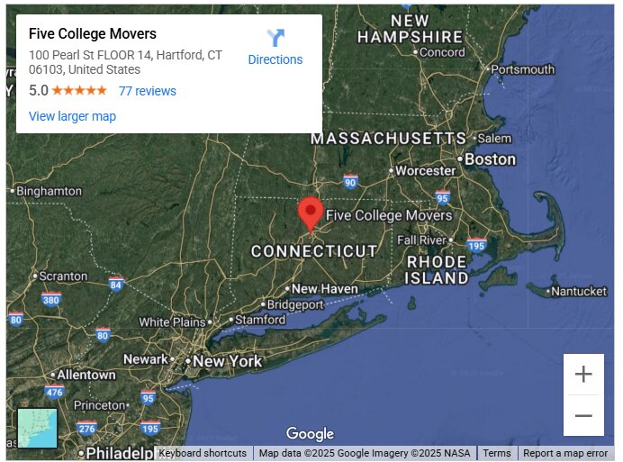 As a licensed and insured moving company Hartford residents can rely on, Five College Movers has built a strong reputation for reliability, transparency, and affordability. With over 1,000 five-star reviews from satisfied customers, the company continues to stand out as one of the best movers in Hartford CT for its consistent, high-quality service.