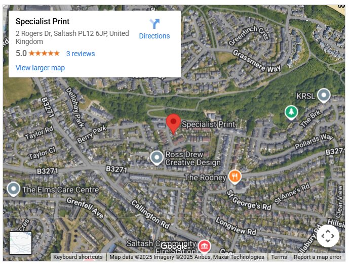 Specialist Print, based in Saltash, Cornwall (2 Rogers Drive, PL12 6JP), has supplied high-quality printed products across Devon, Cornwall, and the UK for over 12 years. The company specialises in school identity and visitor management systems, signage, promotional clothing, and business print. Its online printing services support artwork upload or custom design options, with free mainland UK delivery and fast turnaround. Operating hours: Monday through Friday, 9:00 a.m. to 5:00 p.m. The company is 5-star rated on Google, with long-term clients praising its quality and reliability.
