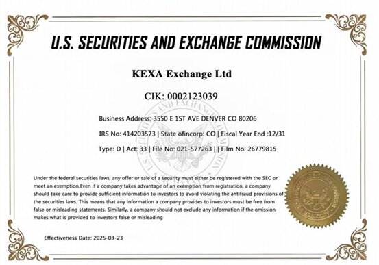 KEXA Exchange, a leading digital asset trading platform based in Denver, Colorado, today announced that its Form D filing, submitted to the U.S. Securities and Exchange Commission (SEC) on March 23, 2025, has officially become effective. This significant milestone marks KEXA Exchange's formal entry into the ranks of institutional-level compliant exchanges, offering institutional investors, professional traders, and high-net-worth individuals a more transparent, secure, and strictly regulated environment for digital asset trading.