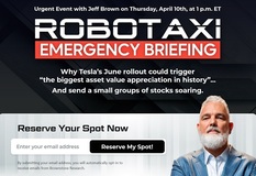 Silicon Valley expert Jeff Brown will host "The Robotaxi Emergency Briefing" on April 10 to discuss Tesla’s self-driving robotaxi fleet, set to launch in June, and its potential market impact.